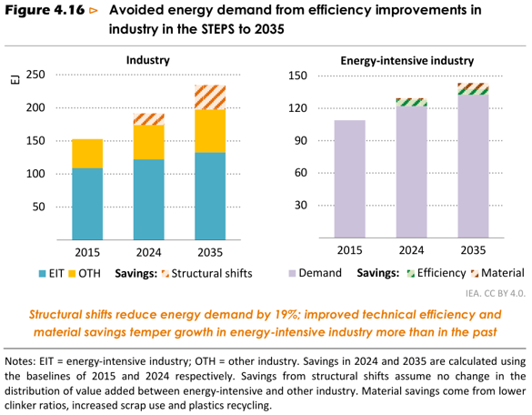 • Structural shifts imply electrification: moving to less energy-intensive processes. Energy efficiency implies improved design of electrical machines, and optimal regulation of their operation through variable-speed drives. Material savings imply more effective manufacturing and recycling.